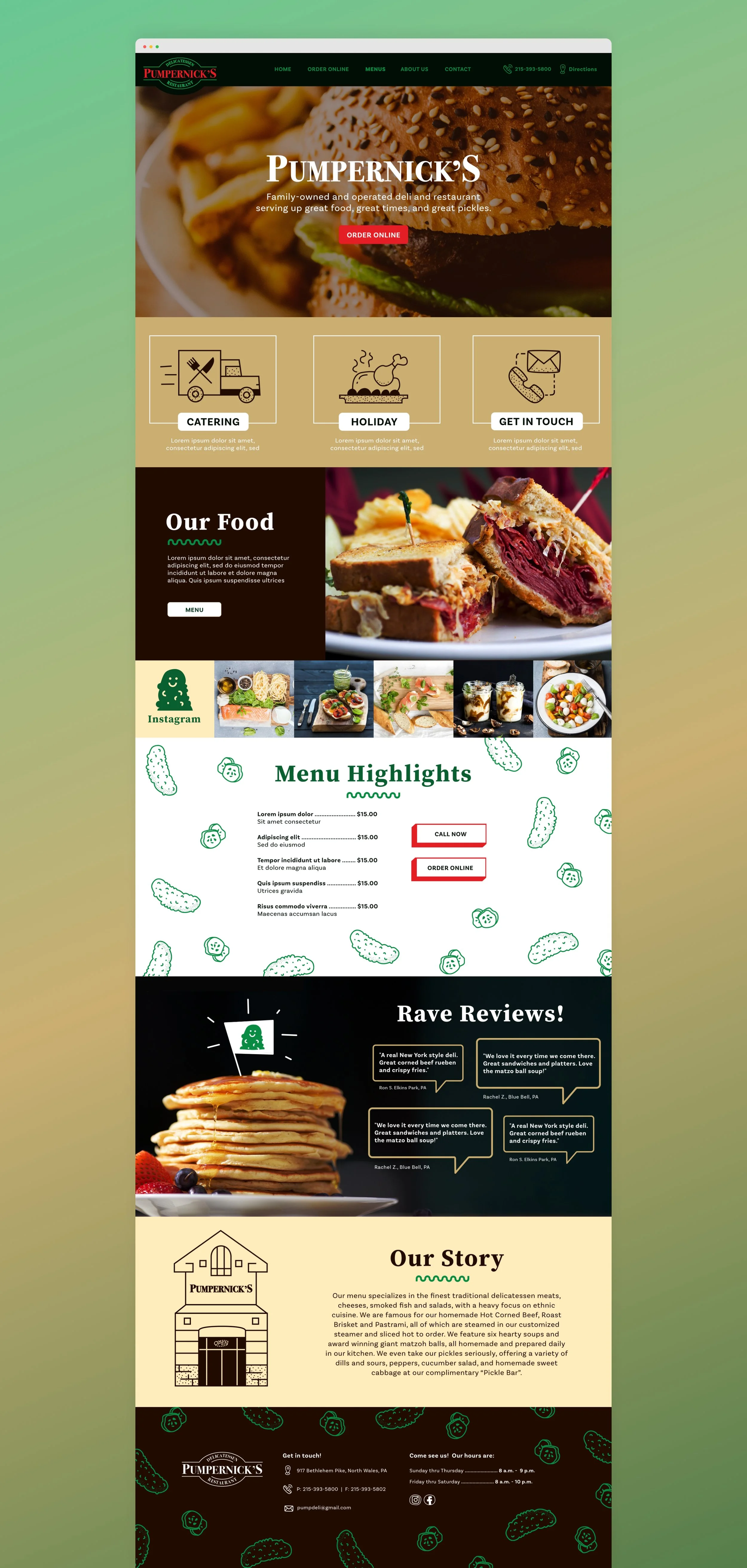 Pumpernick’s Delicatessen Website Design Proposal Web redesign proposal for Pumpernick’s Delicatessen. I included hand-drawn illustrations to promote a sense of family fun and highlight their famous pickles. View fullsize